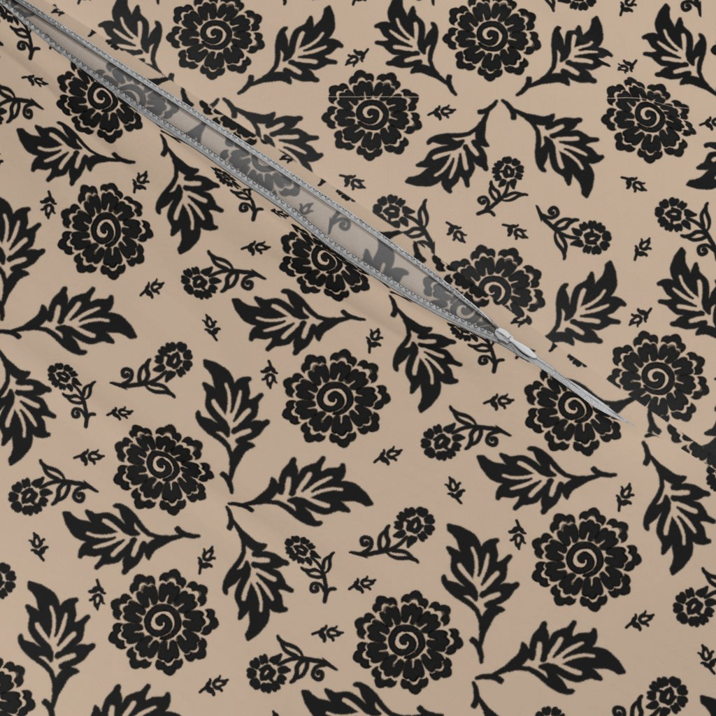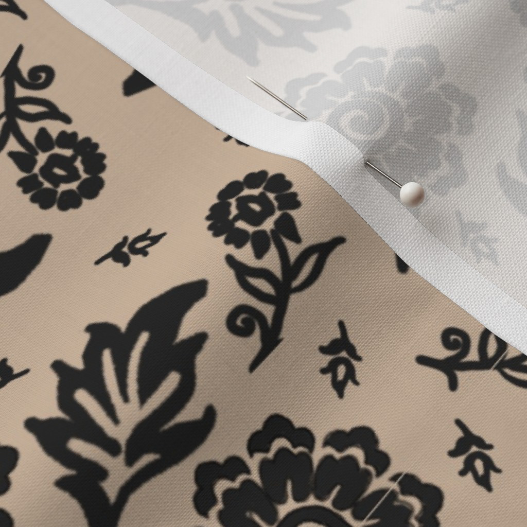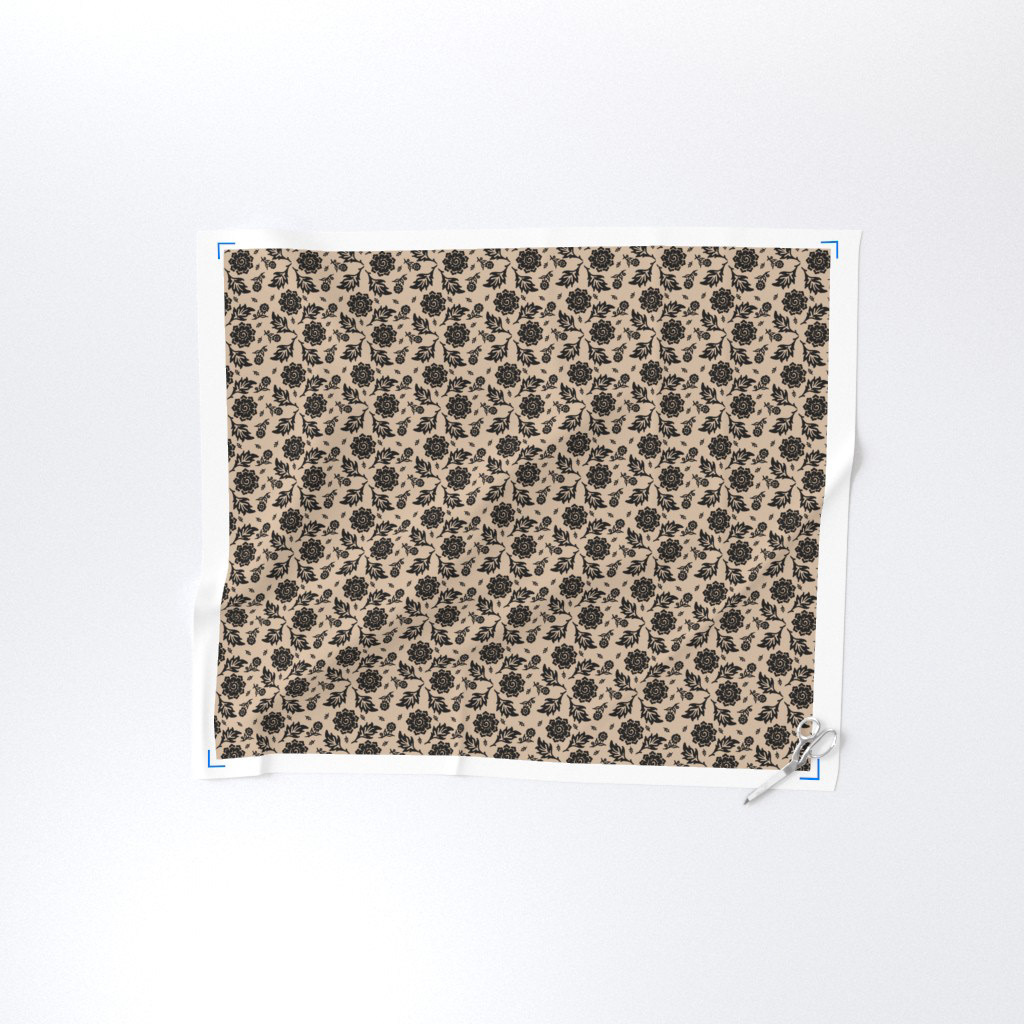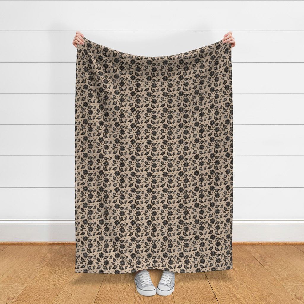 Cottage Floral© A repetitive floral pattern featuring black flowers and leaves adorns a Khaki background. The design is symmetrical and presents an elegant, classic wallpaper or textile design.