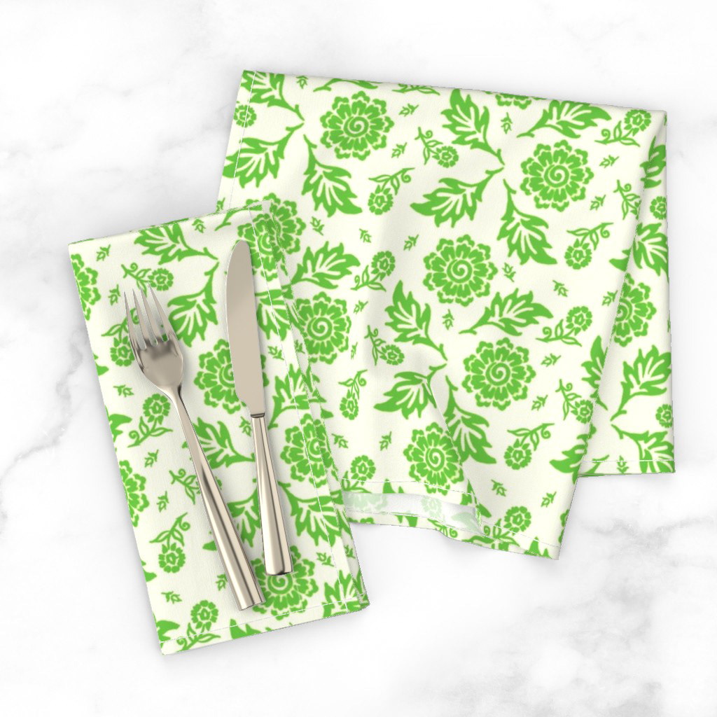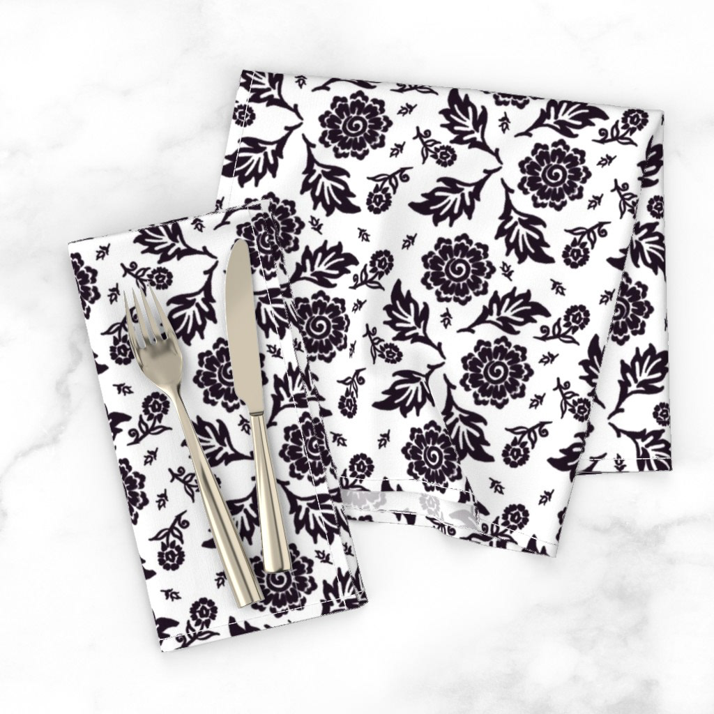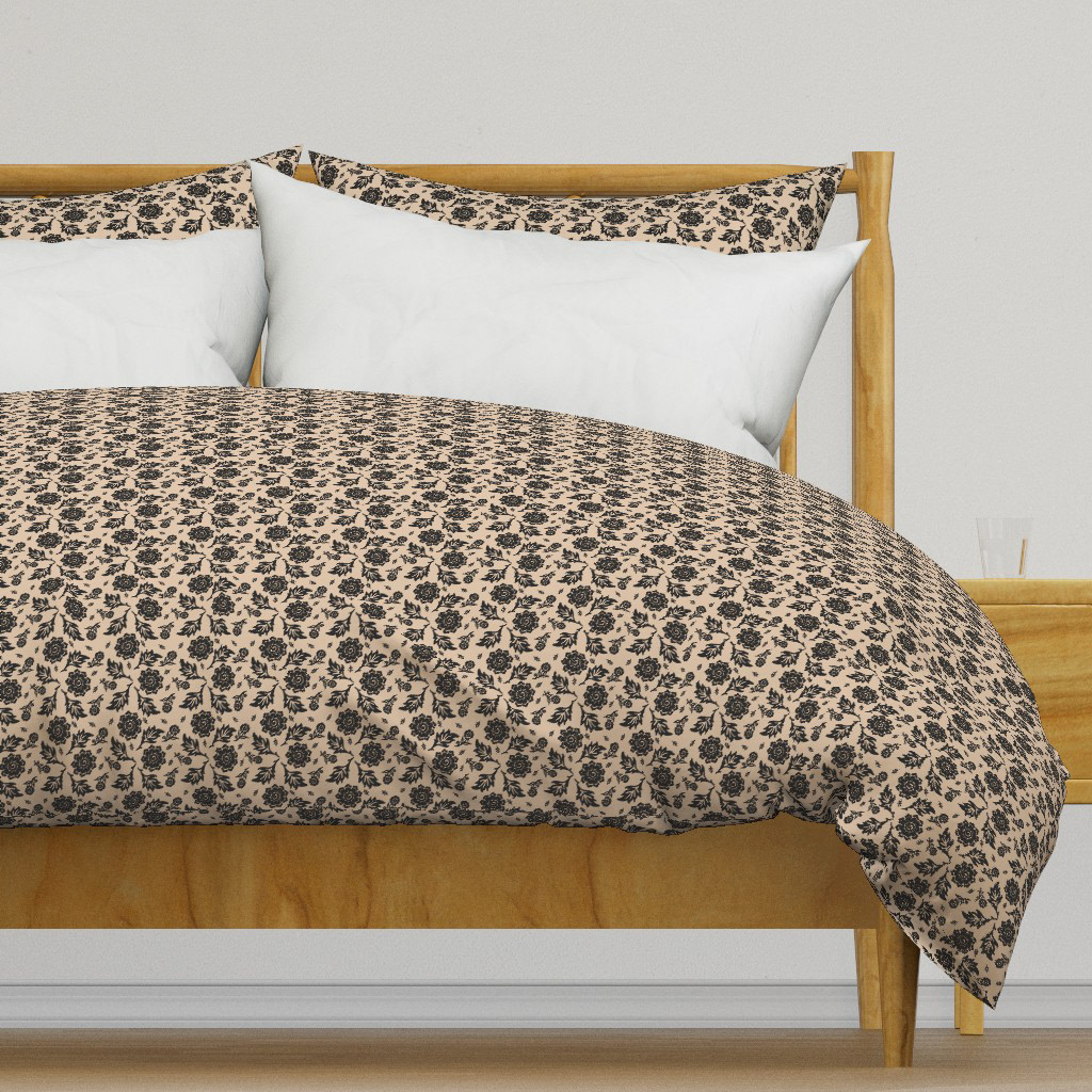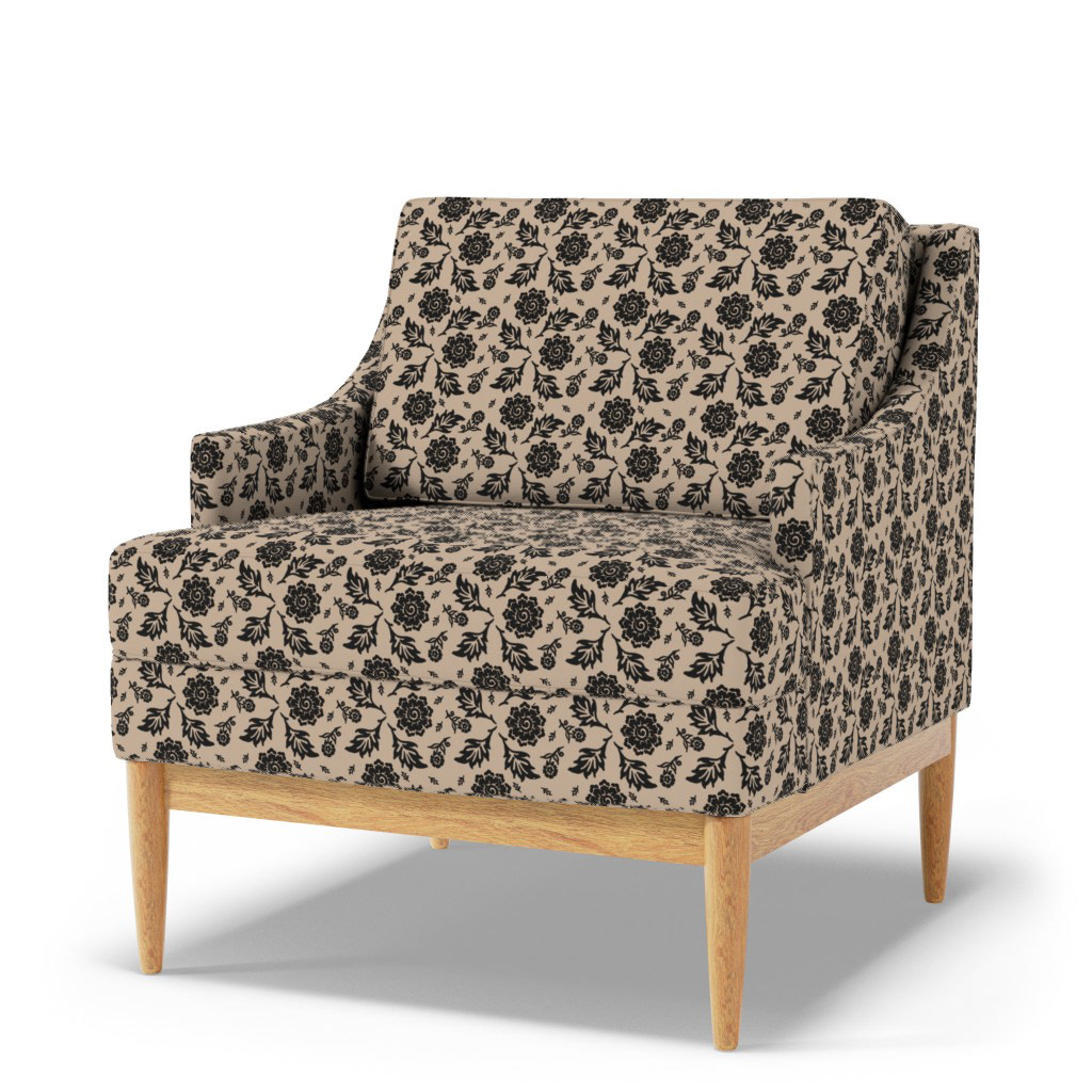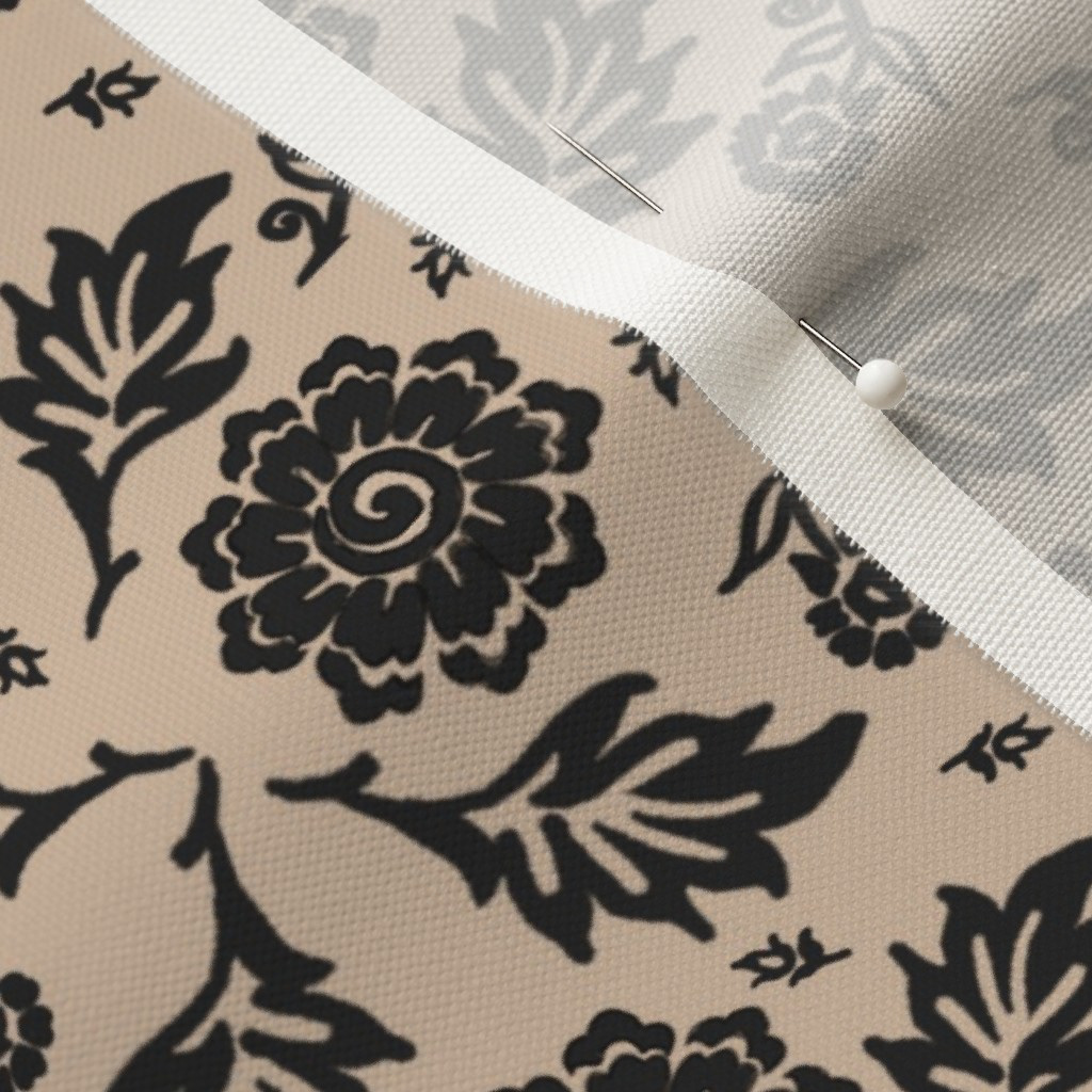 Cottage Floral© A repetitive floral pattern featuring black flowers and leaves adorns a Khaki background. The design is symmetrical and presents an elegant, classic wallpaper or textile design.